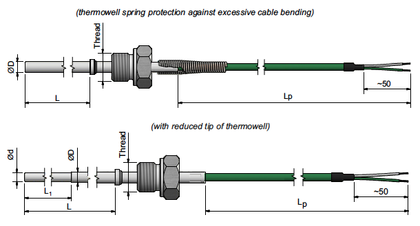 ConstructionThe sensor consists of thermocouple cable, protection tube with moveable threaded process connection.
