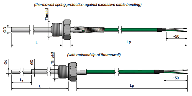 ConstructionThe sensor consists of thermocouple cable, protection tube with threaded process connection and cable.