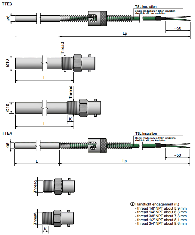 TTE3 sensor consists of thermocouple cable, protection tube made out of stainless steel, adjustable bayonet cap with spring and additional external thermowell with threaded process connection. TTE4 sensor is provided with bayonet adaptor, without additional external thermowell. .