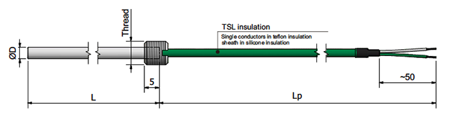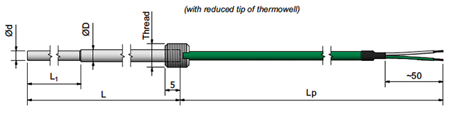 The sensor consists of thermocouple cable, protection tube made out of stainless steel and moveable threaded process connection.